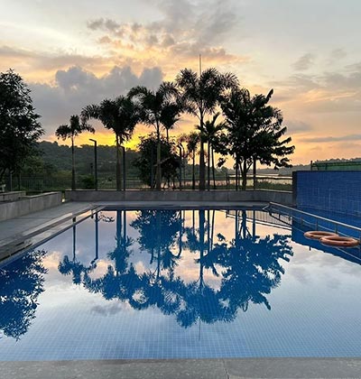 Your booking includes access to all of WeGrow’s amenities: the private swimming pool, open sky theatre, play area, and spacious rooms.